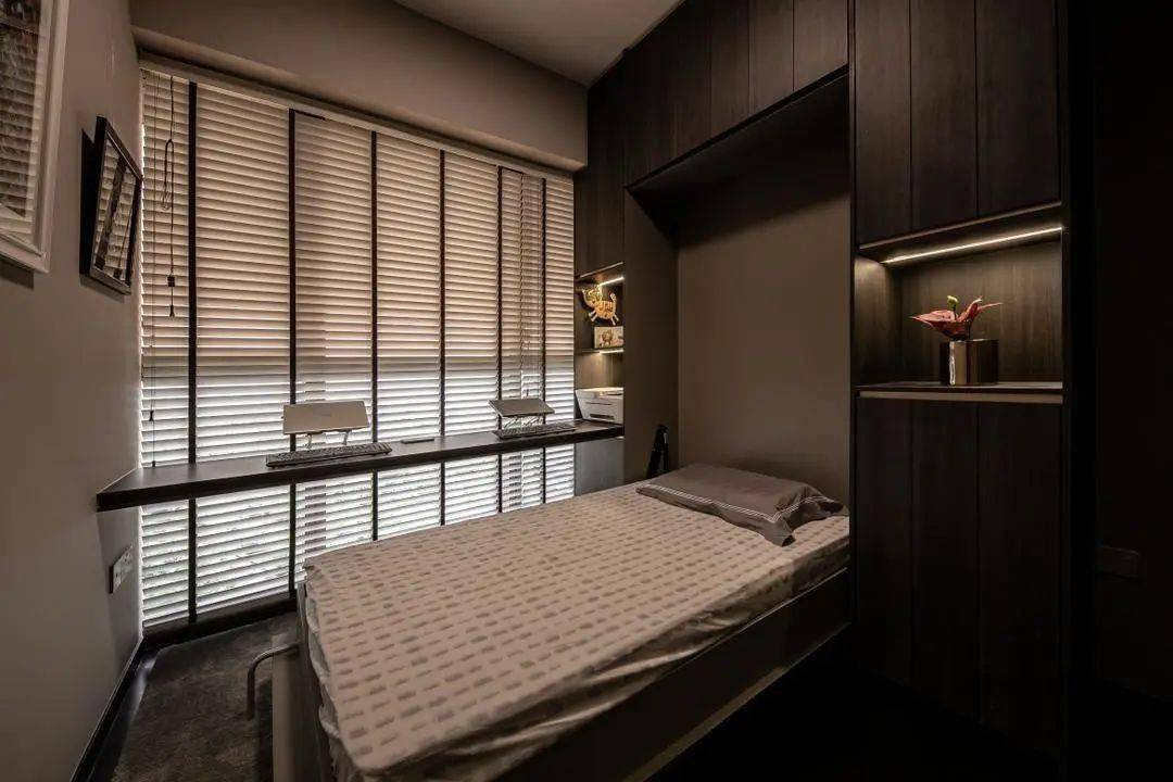 床头面积比较小,也可以考虑在侧面内嵌一个更简单的置物区,用来随手放手机、水杯等物品,顶部加入吊柜,用来收纳书本等杂物也很不错,提高了空间利用率。